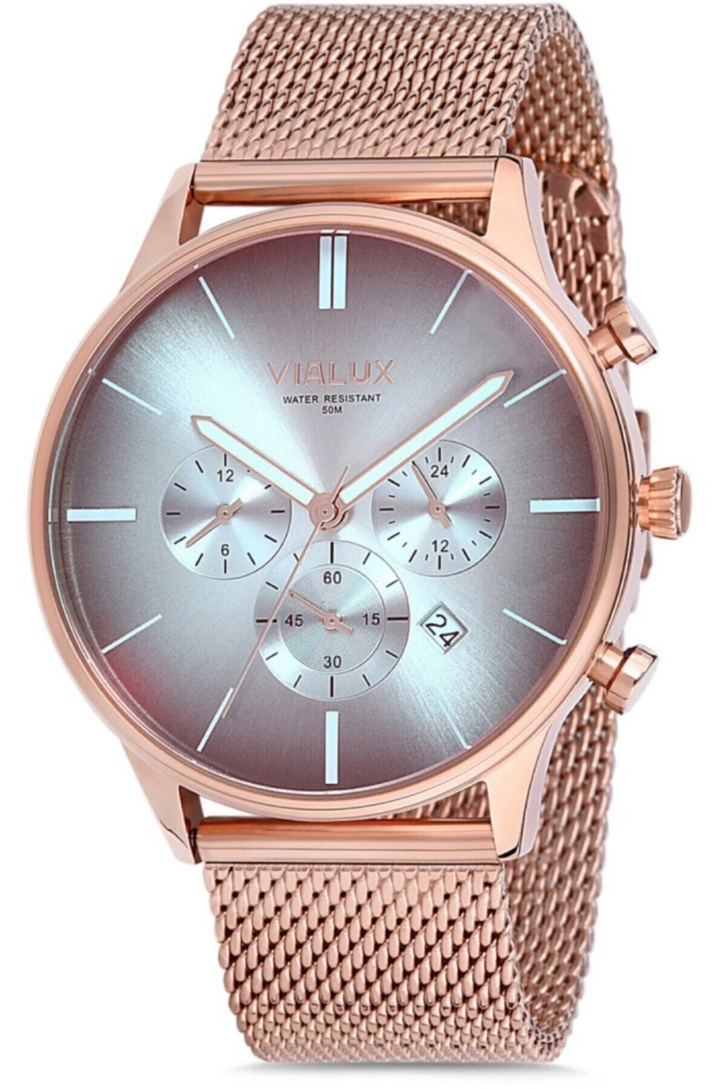 VIALUX, saat yapımındaki profesyonelliği ve benzersiz teknikleri ile ününü tüm dünyaya duyurmuş ve bu ününü tüm modellerine taşıyarak saat tutkunlarının tüm beklentilerini karşılayan bir marka olmuştur; Smart CollectionSpor ve şıklığı bir araya getiren Smart Collection, her ana uyum sağlayabilen aktif ama klas çizgileriyle dikkat çekiyor ÜRÜN BİLGİSİ Cinsiyet:Erkek Koleksiyon:Smart Collection Ürün Kodu:VX510R; 02SRX Çalışma Şekli:Japon Analog Makine Modeli:Japon Seiko VD33 KASA Kasa Materyali:Paslanmaz Çelik Kasa Şekli:Yuvarlak Kasa Çapı:43 mm Kasa Rengi:Rose Gold KADRAN & CAM Kadran Rengi:Gümüş Cam Cinsi:Mineral Cam Şekli (Özelliği):Bombeli KORDON Kordon Tipi:Paslanmaz Çelik Örgü Kordon Rengi:Rose Gold Kordon Kilidi:Kilitli Klips Kordon Genişliği:22 mm ÖZELLİKLER Su Geçirmezlik:5 ATM Takvim:Tarih ve Gün, 12; 24 Saat Göstergesi Fonksiyonlar:Çift Zaman Dilimi;;